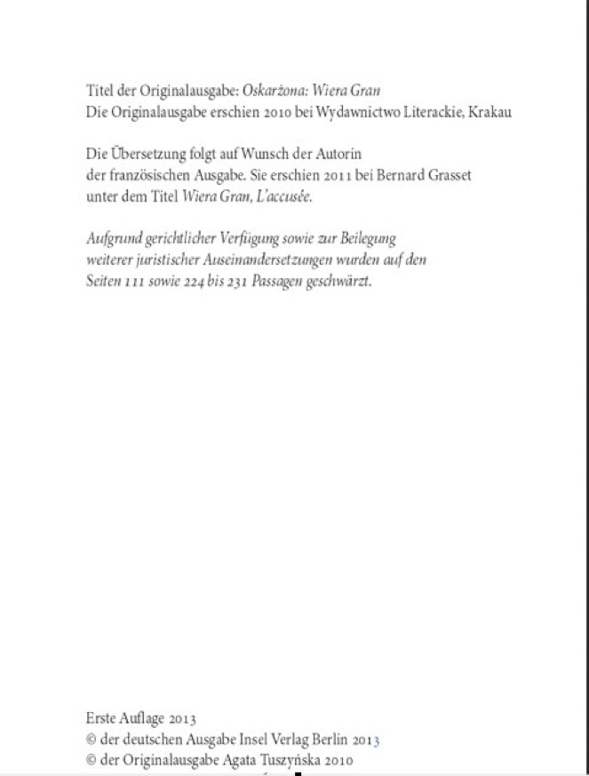 Der Autorin ist es gelungen, die Vorbereitung von Veröffentlichung in Deutschland bei Suhrkamp Verlag-Insel zu schaffen, der vor Jahren ein Buch von Martin Walser veröffentlicht hat - Der Tod eines Kritikers, mit der berühmten Einführung des Begriffes " Auschwitzkäule", die angeblich (in der Jüdischen hand) die Deutschen an ihre Verbrechen erinnern wurde.