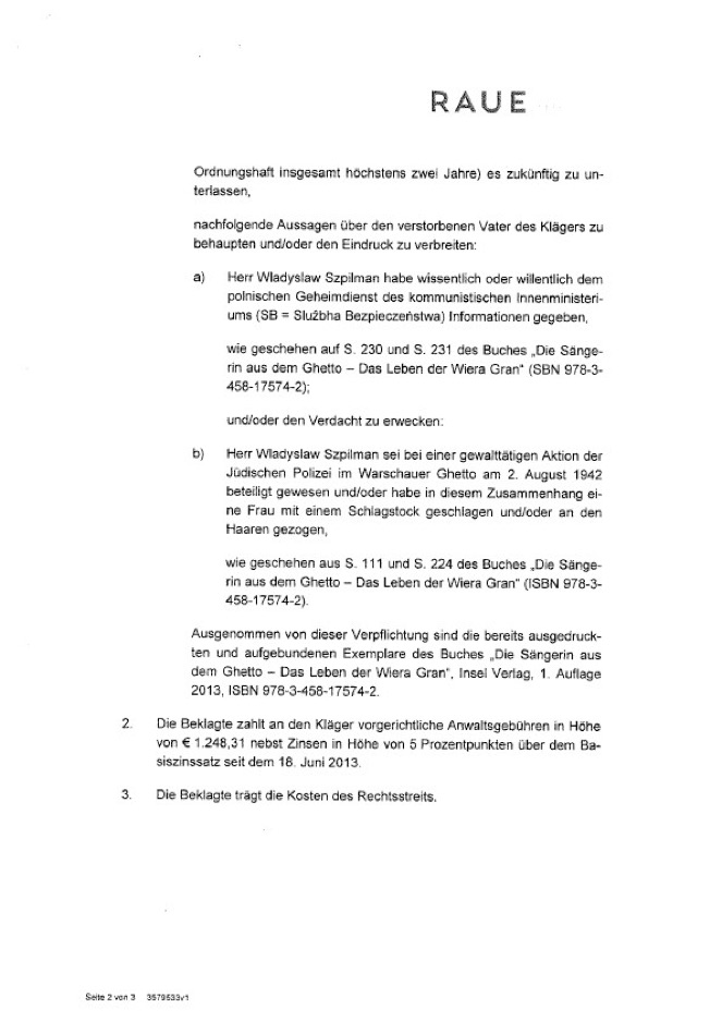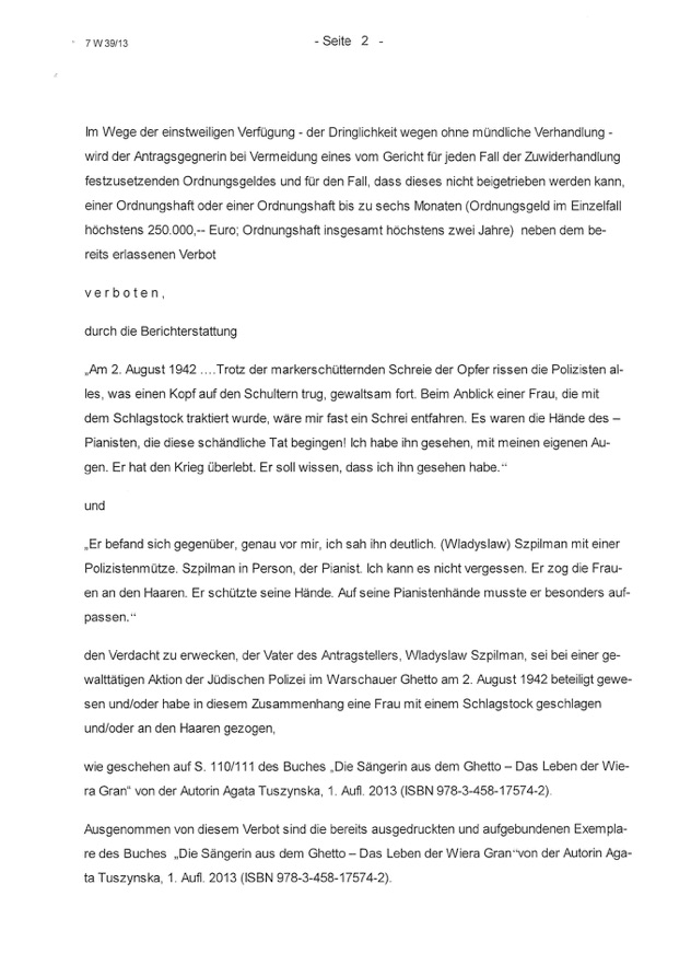 Das Urteil kann nicht mehr angefochten werden. Autorin und Verlag müssen sich öffentlich entschuldigen und die betreffenden Passagen aus künftigen Auflagen streichen. Tuszyńska äußerte sich in der Zeitung "Gazeta Wyborcza" "enttäuscht". Andrzej Szpilman dagegen wertete das Urteil als Sieg für die "ethischen Standards" und einen kritischen Umgang mit der Meinungsfreiheit in Polen.