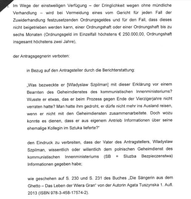 Die größte Sensation scheint zu wecken falsche und ohne Grundlagen präsentierte Behauptung, dass für alle Misserfolge der Vera Gran, trägt die Verantwortung der in der ganzen Welt bekannter Pianist und Komponist Wladyslaw Szpilman. Der „beneidenswerter“ Pianist mit einem Konto von fast 500 Songs, einer Reihe von symphonischen Werken und mehr als tausend Konzerten in den größten Konzertsällen der Welt, publizierte seine Erinnerungen aus dem Warschauer Getto „Tod einer Stadt“-später als"Der Pianist" bekannt unter seinem eigenen Namen unmittelbar nach dem Krieg (Jan.1946) veröffentlicht hat. Niemand in den vergangenen 65 Jahren hat Einwendungen gegen den Inhalt des Buches oder Wladyslaw Szpilmans Haltung während des Krieges vorgebracht. Auch wenn es viele Neider und Antisemiten gerne getan hätten!
