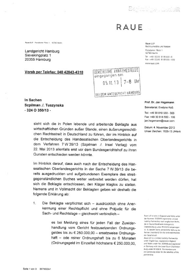 Am 13 Juni 2013 informierte uns Herr Rechtsanwalt Prof. Jan Hegemann über die Entscheidung des Verlages die elektronische Ausgabe des Buches vollständig vom Markt zu nehmen.